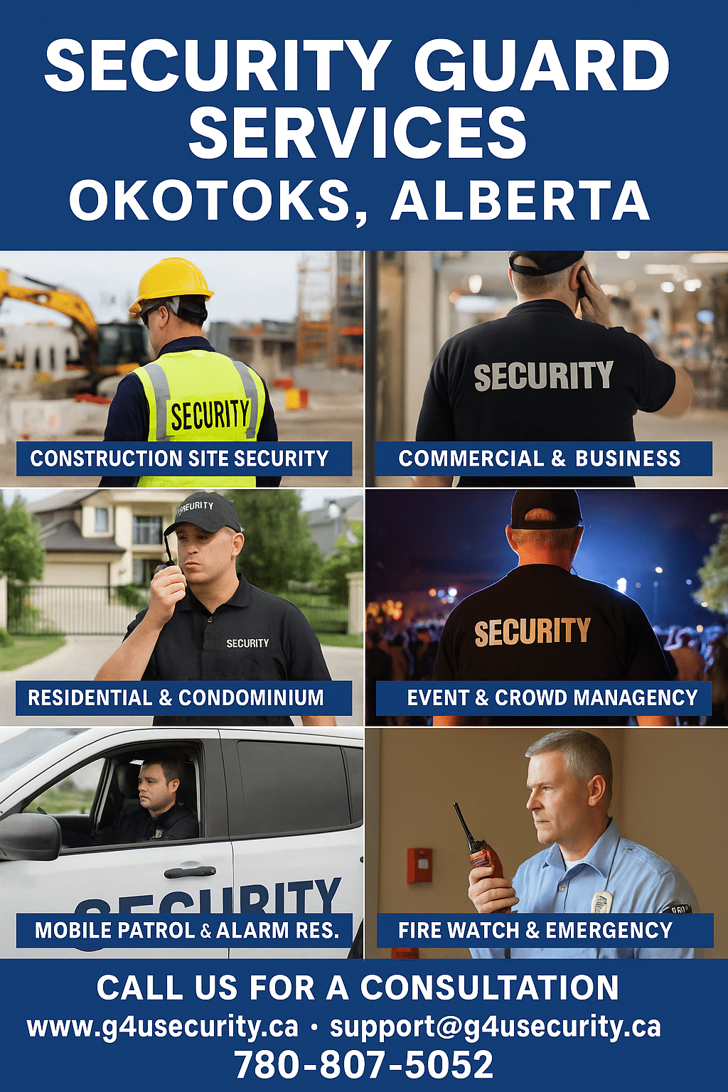 Why choose G4U Security Ltd in Okotoks Alberta for Security Guard Services? Fully licensed and insured under Alberta law; OHS-trained guards who adhere to transparent pricing starting at $21/hour; 24/7 coverage for mobile, event and static sites as well as real-time GPS patrol tracking reporting